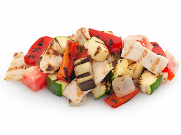 Ingredientes: calabacín asado, cebolla asada, berenjena asada, pimiento rojo asado, pechuga de pollo asado, tomate, y saborizante braseado.